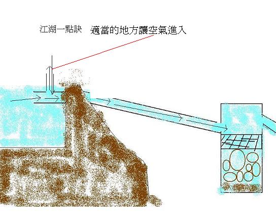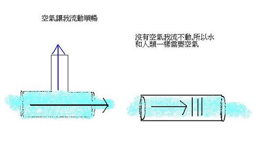 當然,事情沒有想像中單純,水必須有足夠的空氣才能流動,而管線是封閉的,所以必須在適當的地方,將水管切斷,另外準備一個丁字管,讓水流動時,將空氣吸入,這非常重要,而且是關鍵所在.至於要在那邊接上丁字管,沒有一定的準則,通常遇到問題後,才來判斷,與適當的嘗試。