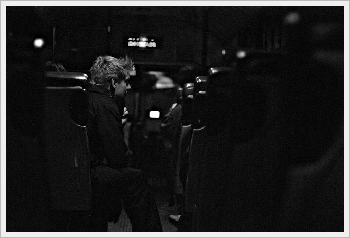 我走到車子最後面的座位,使用高感光度,捕捉了幾張,有一張是放在大腿上按下快門,因為沒有自動對焦,所以必須先目測相機與他之間的距離,調整好焦距之後,按下快門。